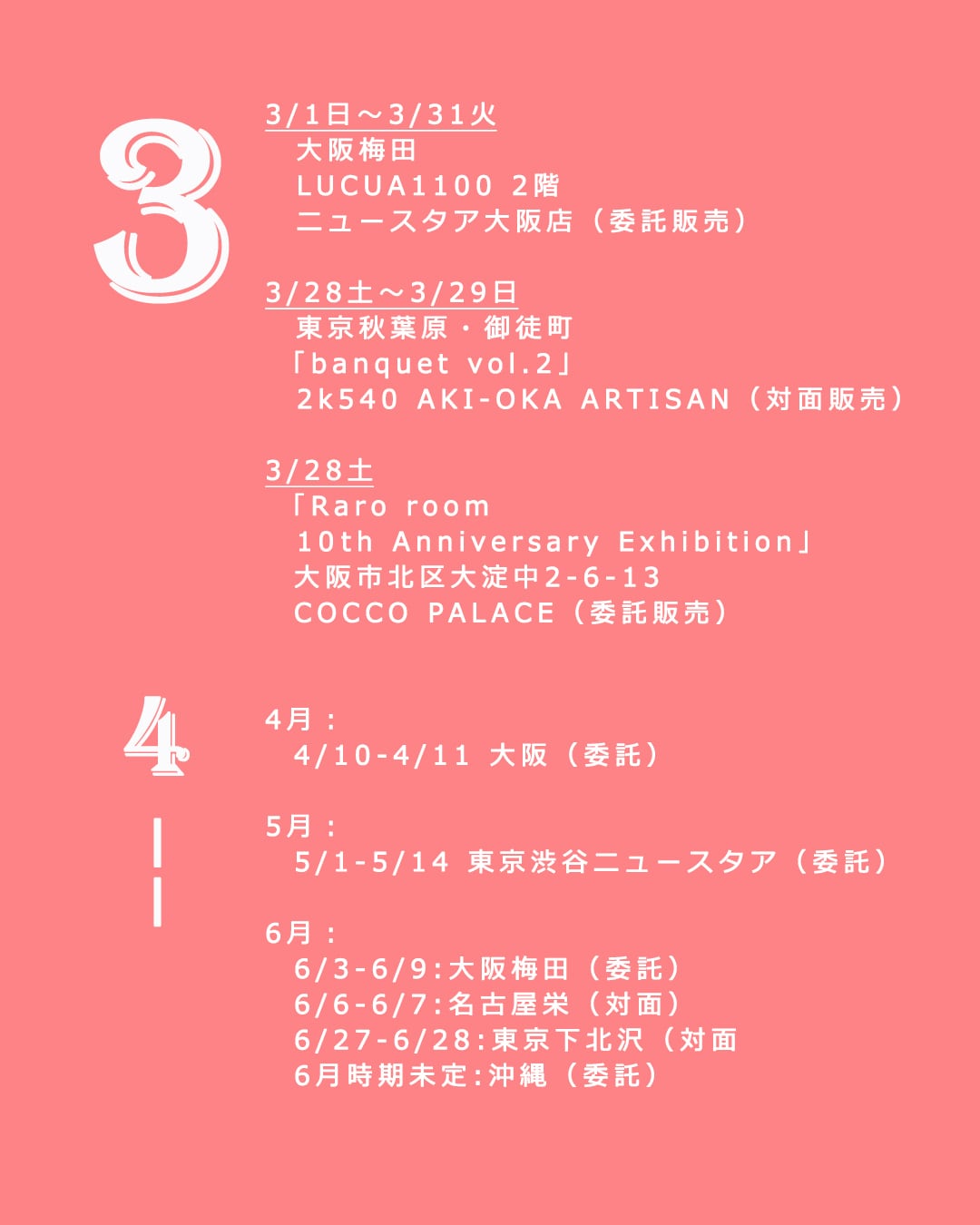 2026年も各所でポップアップや委託販売を予定しております。普段オンラインショップから御愛顧頂けている皆様にもアクセサリーの実物をご覧頂ける機会となります。開催地が、お住まい、お仕事先、用事先などのお近くでしたら、是非この機会にお立ち寄り下さい。